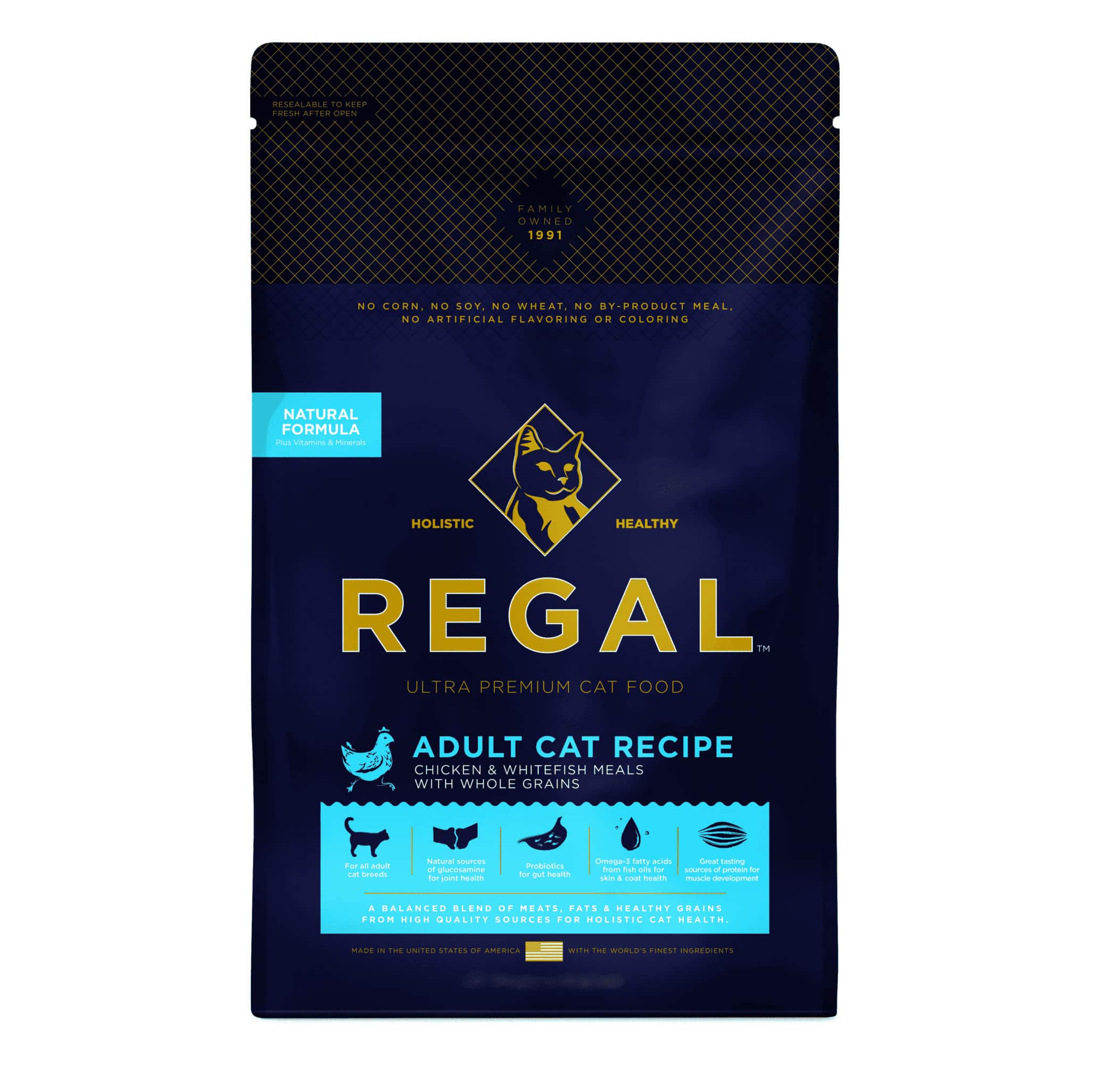 REGAL | ריגל מזון איכותי לחתולים בוגרים סופר פרמיום הוליסטי חתולים משתוקקים לטעמים הבשריים האלה Regal Adult Recipe Dry Cat Food. הפורמולה של רגל, מיועדת לחתולים פחות פעילים, ארוחה גדושה בחומרים מזינים זו כוללת שילוב של עוף ללא אנטיביוטיקה עשיר בחומצות אמינו, דגנים מלאים של מזון-על, פחמימות לא רגישות, ויטמינים וחומצות אמינו חיוניות.
